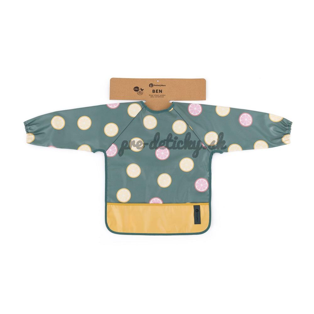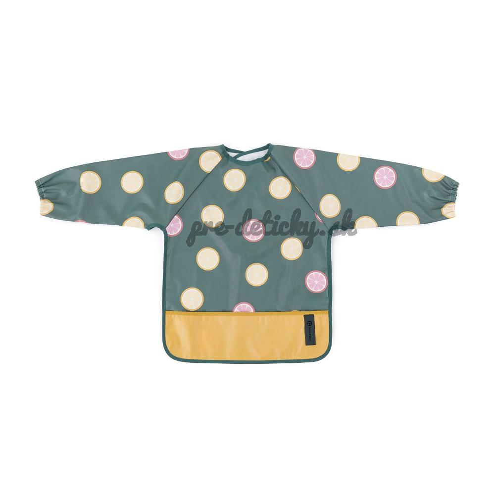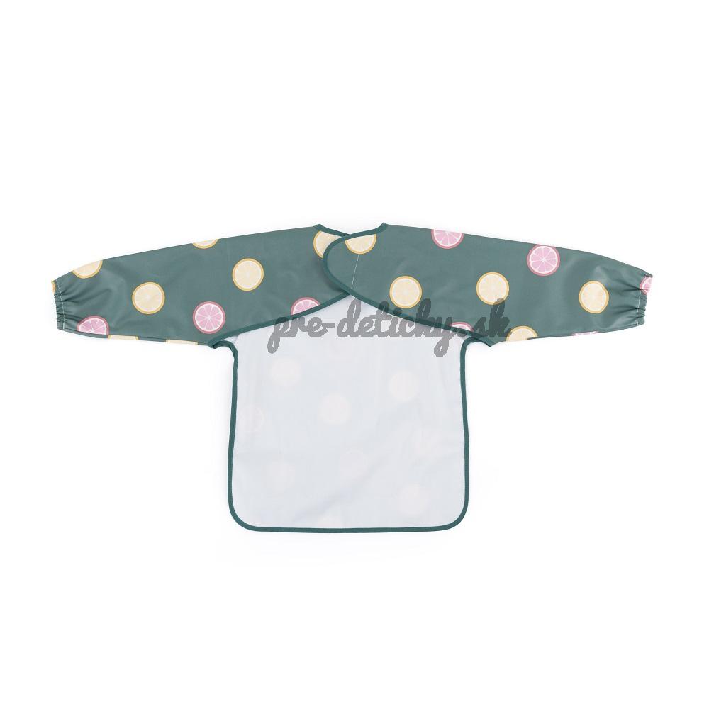 Pohodlný, nepremokavý podbradník s dlhým rukávom je vyrobený z rýchloschnúceho, bezpečného PU materiálu, úplne bez PVC a ftalátov. Predné vrecko na omrvinky zabezpečí poriadok a pohodlie pri kŕmení a dlhé rukávy s gumičkou chránia oblečenie pred zašpinením a namočením. Podbradník je veľmi jemný na dotyk a zapína sa na mäkký suchý zips. Možno ho používať nielen pri jedle, ale aj pri výtvarných prácach. Ak ho chcete udržať v čistote, po použití ho jednoducho utrite vlhkou handričkou.