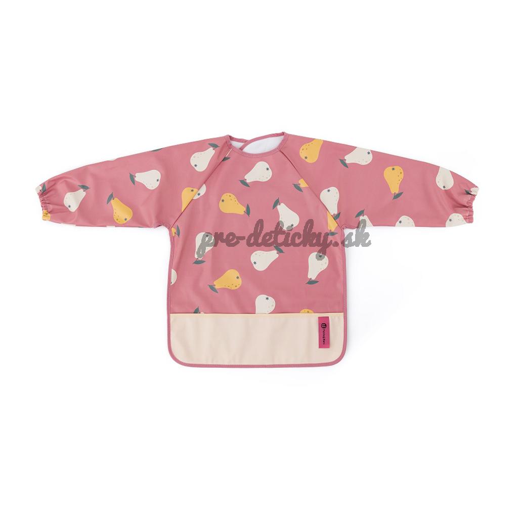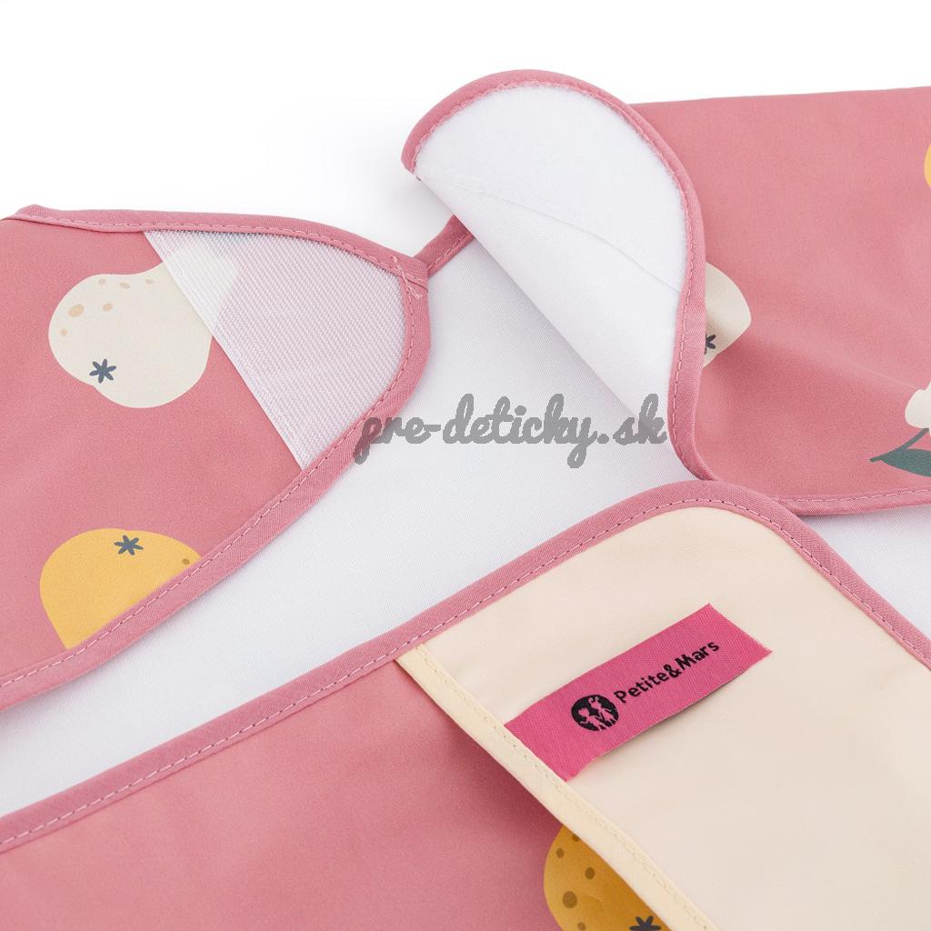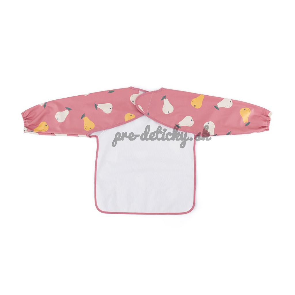 Pohodlný, nepremokavý podbradník s dlhým rukávom je vyrobený z rýchloschnúceho, bezpečného PU materiálu, úplne bez PVC a ftalátov. Predné vrecko na omrvinky zabezpečí poriadok a pohodlie pri kŕmení a dlhé rukávy s gumičkou chránia oblečenie pred zašpinením a namočením. Podbradník je veľmi jemný na dotyk a zapína sa na mäkký suchý zips. Možno ho používať nielen pri jedle, ale aj pri výtvarných prácach. Ak ho chcete udržať v čistote, po použití ho jednoducho utrite vlhkou handričkou.
