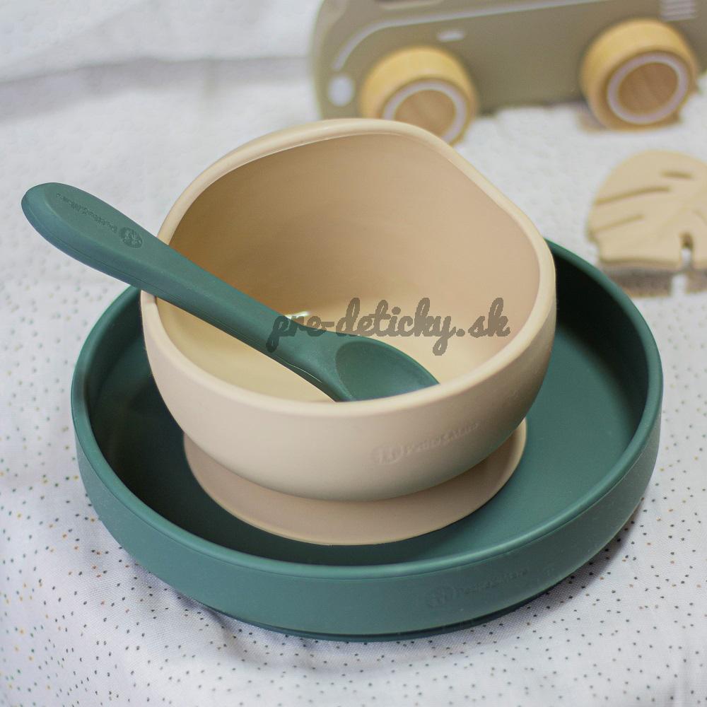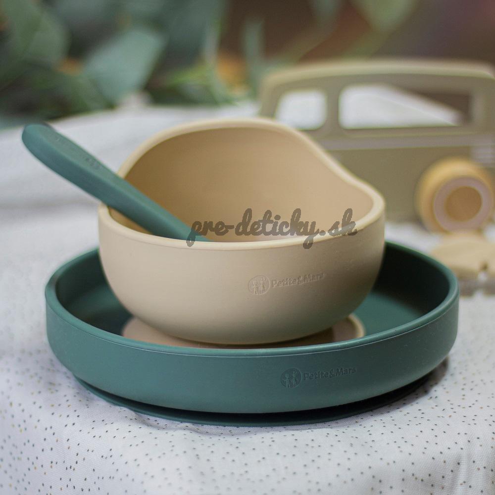 PETITE&MARS Set jedálenský silikónový TAKE&MATCH 4 ks Desert Sand - Misty Green 6m+