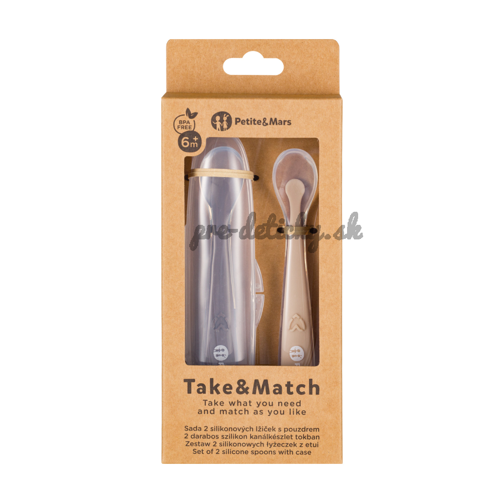 Sada na kŕmenie TAKE&MATCH je navrhnutá tak, aby každé jedlo bolo zábavným zážitkom. Každá lyžička bola starostlivo tvarovaná tak, aby povzbudzovala vaše dieťa k objavovaniu jedla a rozvíjaniu samostatnosti pri jedení. Flexibilný silikónový materiál umožňuje lyžičkám mierne sa ohýbať, prispôsobovať sa pohybom vášho dieťaťa a uľahčovať samostatné kŕmenie. Mäkký potravinársky silikón je šetrný k citlivým ďasnám a prvým zúbkom, zatiaľ čo ergonomická rukoväť pohodlne padne do malých rúčok.