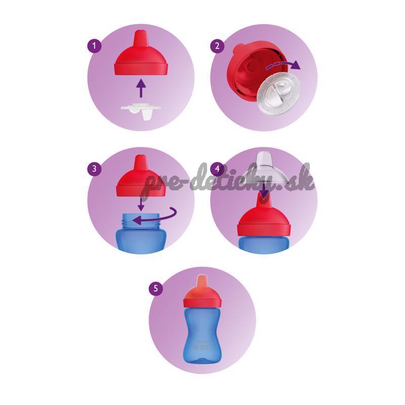 Varovanie – Pred každým použitím hrnček s náustkom skontrolujte. Ak objavíte akúkoľvek prasklinu alebo poškodenie, okamžite prestaňte používať. – Tento výrobok vždy používajte pod dozorom dospelej osoby. – Trvalé a dlhodobé pitie tekutín spôsobuje zubný kaz. – Neodporúčame používať pre ohrievanie tekutín alebo pokrmov mikrovlnnú rúru. Mikrovlnné rúry môžu pozmeniť kvalitu potravín/nápojov a zničiť niektoré cenné živiny a môžu v určitých miestach vytvárať vysoké teploty. Pri ohrievaní jedla v mikrovlnnej rúre preto dbajte na zvýšenú opatrnosť. Keď ohrievate tekutiny alebo jedlo v mikrovlnnej rúre, vkladajte do nej iba nádobu bez tesniaceho krúžku, náustku a bez vrchnáku. Ohriate jedlo vždy premiešajte, aby ste zaistili rovnomerné rozloženie tepla. – Pred kŕmením vždy skontrolujte teplotu pokrmu. – Nedovoľte dieťaťu, aby sa hralo s malými časťami alebo aby pri používaní fliaš a hrnčekov chodilo či behalo. – Všetky časti, ktoré nepoužívate, udržujte mimo dosahu detí. Upozornenie – Pred prvým použitím rozoberte všetky časti a dôkladne ich umyte a sterilizujte. Diely hrnčeka s náustkom dajte na 5 minút do vriacej vody. Tým zaistíte nevyhnutnú hygienu. – Hrnček s náustkom môžete sterilizovať aj v elektrickom sterilizátore alebo sterilizátore do mikrovlnnej rúry. Sterilizáciu akejkoľvek časti hrnčeka s náustkom v mikrovlnnej rúre robte jedine použitím vhodného sterilizátora alebo sterilizačných sáčkov (SFC297) Philips AVENT. – Pred podaním hrnčeka s náustkom dieťaťu vždy skontrolujte, či sú všetky časti správne zostavené. – Tento hrnček s náustkom je určený pre riedke nápoje. Najlepšími nápojmi pre dieťa akéhokoľvek veku sú voda a mlieko. – Husté či perlivé nápoje alebo nápoje obsahujúce dužinu môžu upchať ventil a spôsobiť jeho rozbitie alebo netesnosť. – Hrnček s náustkom nie je určený na prípravu dojčenskej výživy. Hrnček s náustkom nepoužívajte na miešanie ani pretrepávanie dojčenskej výživy, pretože by mohlo dôjsť k upchaniu otvorov a následnej netesnosti hrnčeka. Vrchnák hrnčeka s náustkom príliš neuťahujte. – Náustok nepoužívajte ako cumlík. – Hrnček s náustkom nepoužívajte so sklenenými fľašami. – Nevkladajte hrnček s náustkom do mrazničky. – Aby nedošlo k popáleniu, nechajte horúcu tekutinu pred naplnením hrnčeka s náustkom vychladnúť.