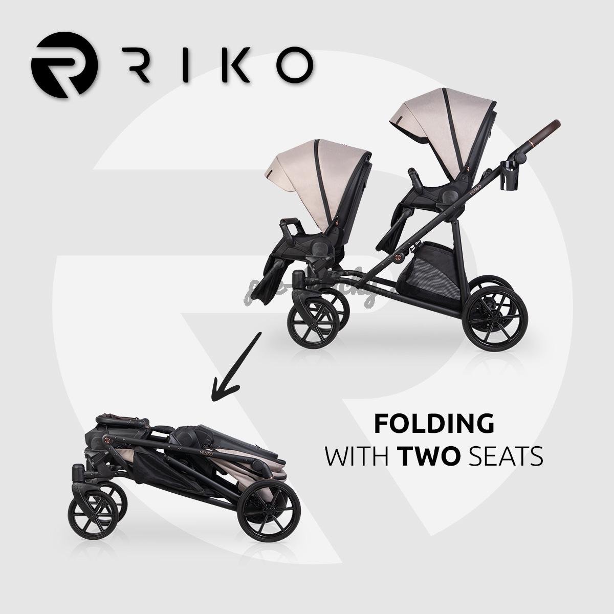 Kočík RIKO MUSSO pre dve deti sa dá zložiť spolu s dvoma sedačkami do malého rozmeru pre tento typ kočíka. Hmotnosť kočíka tiež nie je vysoká na dvojitý tandemový kočík. Samotný rám kočíka spolu s kolesami váži len 9,5 kg, čo je výborný výsledok. Sendvičové sklápacie sedačky a ploché sklápacie vaničky vám pomôžu zmestiť kočík do kufra vášho auta.
