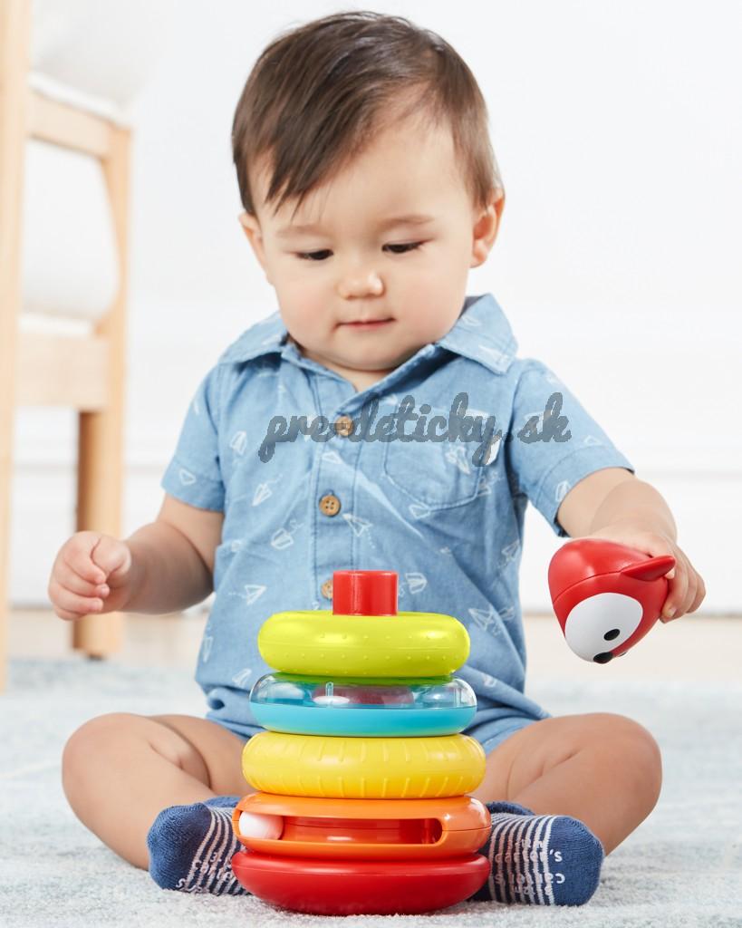 Stohujte, trieďte, hrkajte a kotúľajte krúžky s hračkou na stohovanie pre bábätko. Klasická zábavná hračka stohovacia pyramída, ktorá zabaví dieťatko na dlhý čas a zároveň rozvíja jemnú motoriku a koordináciu oko-ruka. Dieťatko bude rado chytať a ukladať štyri farebné krúžky a vrchnú časť v tvare hlavy líšky na zaoblenú základňu. Hravý spôsob, ako podporiť jemné motorické zručnosti, koordináciu ruka-oko a ešte viac sa učiť a rozvíjať zábavu. Pomáha bábätkám učiť sa farby, počítať, trénovať reakcie, logické a motorické zručnosti.