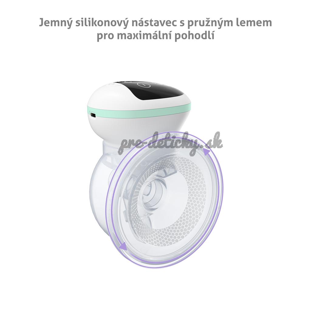 - Priloženie odsávačky k prsníku je príjemné vďaka mäkkému nástavcu z jemného silikónu, ktorý sa prsníku krásne prispôsobí a je šetrný k pokožke.